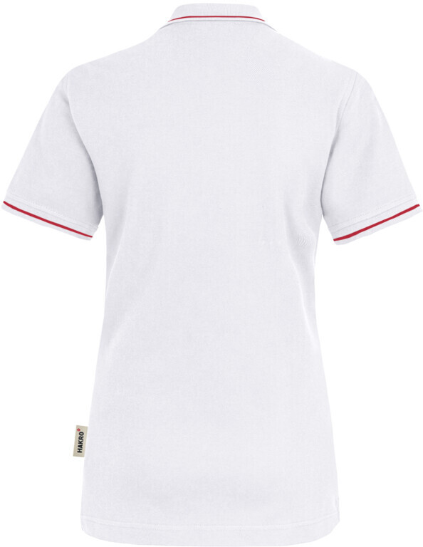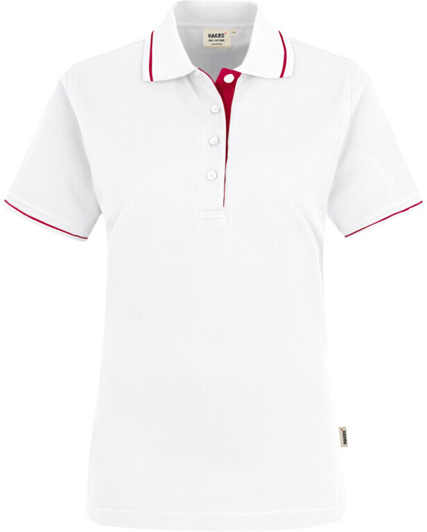 Sportives Poloshirt für Damen, mit Kontraststreifen im Polokragen und an den Ärmelbündchen, hochwertig verarbeiteter, modisch schmaler 4-Loch-Knopfleiste mit extra haltbar angenähten, bruchsicheren Knöpfen, Ton-in-Ton mit dem gelaserten HAKRO Schriftzug. Mit Ersatzknopf, Nackenband und doppelt geriegelten Seitenschlitzen. Hergestellt aus feinmaschigem Piqué aus langstapeliger, gekämmter und ringgesponnener Baumwolle. Gewebtes HAKRO Necklabel aus hochwertigem Kettsatin mit weichen, ultraschallgeschnittenen Bandkanten für höchsten Tragekomfort und gewebtes HAKRO Flaglabel an der linken Seitennaht.