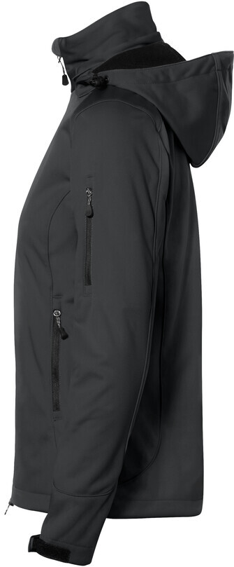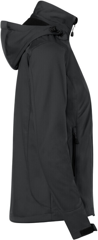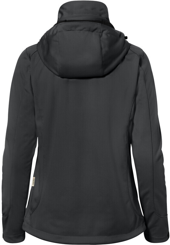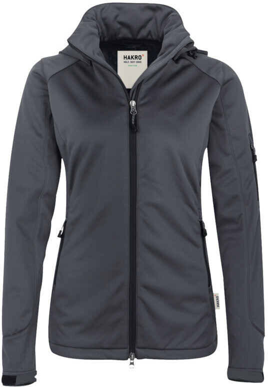Wärmende, atmungsaktive, strapazierfähige Softshelljacke für Damen, mit wasser- und winddichtem Softshellobermaterial, abnehmbarer Kapuze, weitenverstellbarem Saumabschluss mit Tunnelkordelzug und Stoppern, verlängertem, abgerundetem Rückenteil, leichtem Microfleece an der Innenseite, Klettbändern an den Ärmelabschlüssen zum stufenlosen Regulieren, hochwertigem Zwei-Wege-Frontreißverschluss mit innenliegender Windstoppatte und Reißverschlussgarage, Reißverschlusstasche am linken Ärmel und seitlichen Reißverschlusstaschen. Alle Reißverschlüsse von YKK®. Hergestellt aus dehnfähigem Softshellmaterial für exzellente Bewegungsfreiheit aus Interlock-3-Lagen-Laminat mit TRIACTIVE PRO-Technologie. Gewebtes HAKRO Necklabel aus hochwertigem Kettsatin mit weichen, ultraschallgeschnittenen Bandkanten für höchsten Tragekomfort und gewebtes HAKRO Flaglabel an der linken Seitennaht.