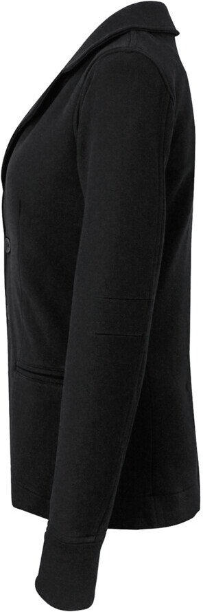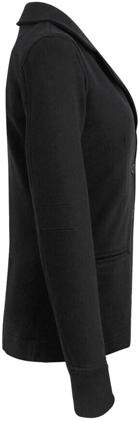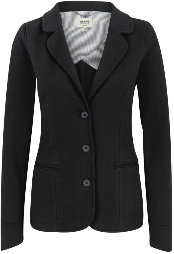 Modisch geschnittener 3-Knopf-Sweatblazer für Damen, mit formgebenden Längsnähten für eine perfekte Passform, Paspeltaschen, Rückenteil mit verdecktem Schlitz, Ärmeln mit Passformabnähern auf Ellbogenhöhe, Teilungsnaht und geschlossener Manschette, Teilfutter aus gestreiftem Gewebe im Rücken, nicht angerauter Innenseite (French­Terry) und Metallkettchen als Aufhänger an der Krageninnenseite. Hergestellt aus pflegeleiter Baumwoll-Polyester-Mischung für höchste Ansprüche. Gewebtes HAKRO Necklabel aus hochwertigem Kettsatin mit weichen, ultraschallgeschnittenen Bandkanten für höchsten Tragekomfort.
