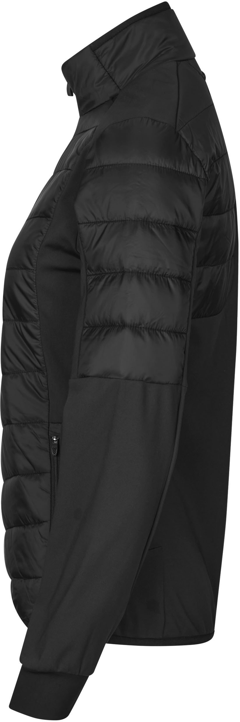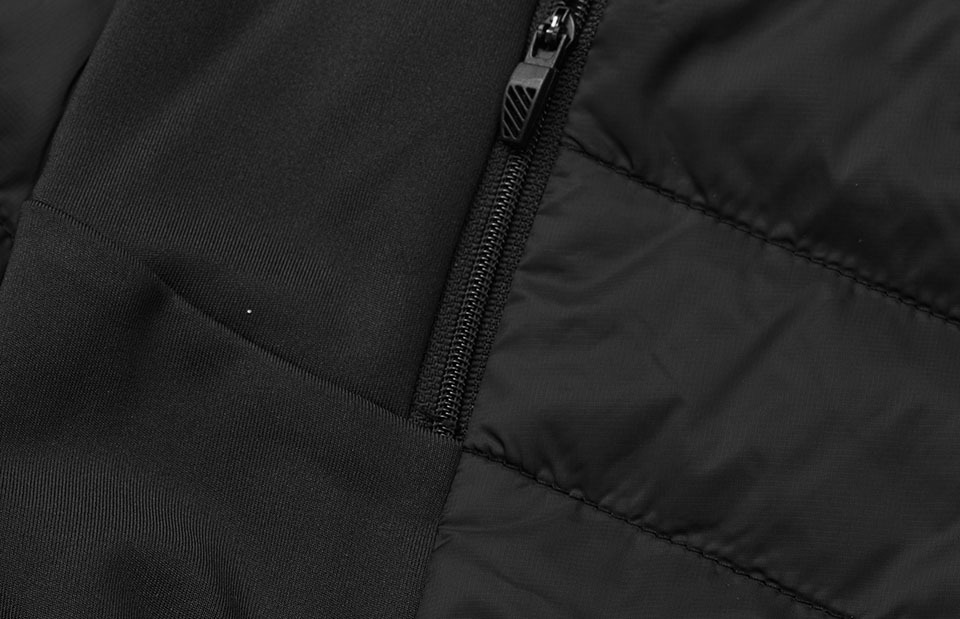 Sportliche Hybridjacke mit THERMOLITE®T-DOWN Wattierung aus recycelten Plastikflaschen. Die Jacke besteht auf weichem 4-Wege Stretchmaterial für optimalen Komfort und Bewegungsfreiheit. Vorderseite, Rücken und Ärmel in leicht gesteppter und winddichter Qualität. YKK Reißverschluss an Vorderseite und Seitentaschen. Gummizug am Saum. Reflektorprint an Vorderseite.