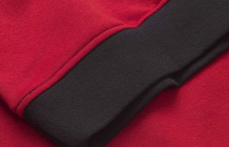 - Ripp am Hals, Ärmeln und Bund für eine gute Passform